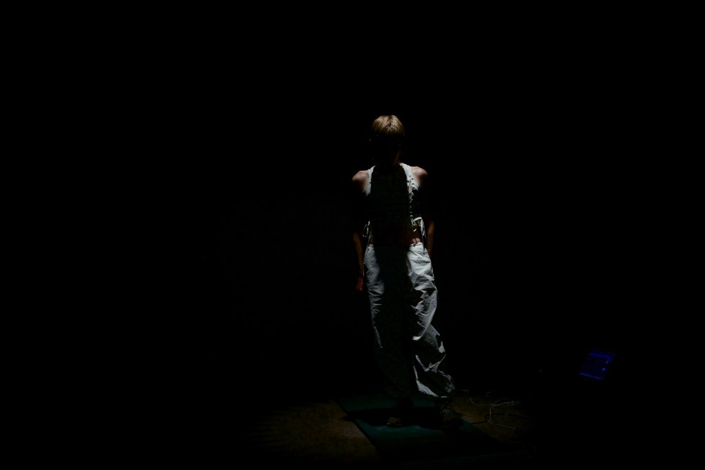 La performance sidewalk::safewalk concrétise les façons dont j’intériorise l’augmentation du support public quant à la régression des droits 2ELGBTQIA+. Sur la scène, un dispositif simulant une série de dalles d’un trottoir réagissent à mes pas tantôt hésitants tantôt assurés pour constituer une pièce déconstruite et entrecoupée d’interventions rappelant les plus récents titres d’actualité sur les manifestions conservatrices (Xénia Gould, Alix Gravel et Yasmine Kessaï). En joignant ma voix à la mouvance des contre-manifestations pour les droits des jeunes trans, sidewalk::safewalk est une appropriation de la scène comme un espace émancipateur.